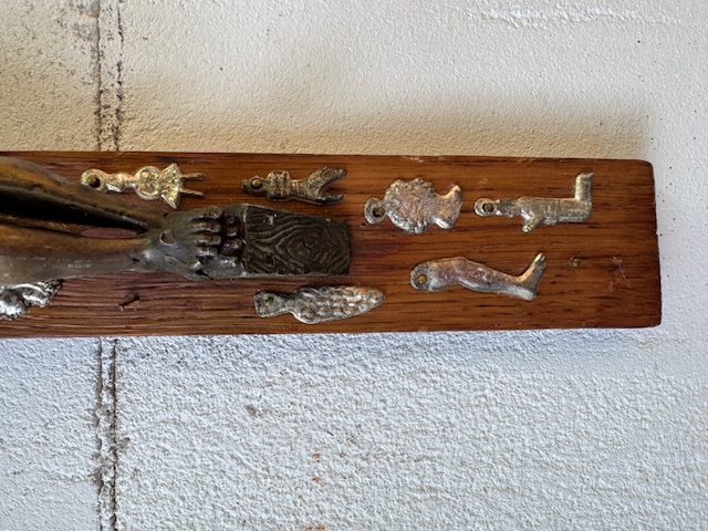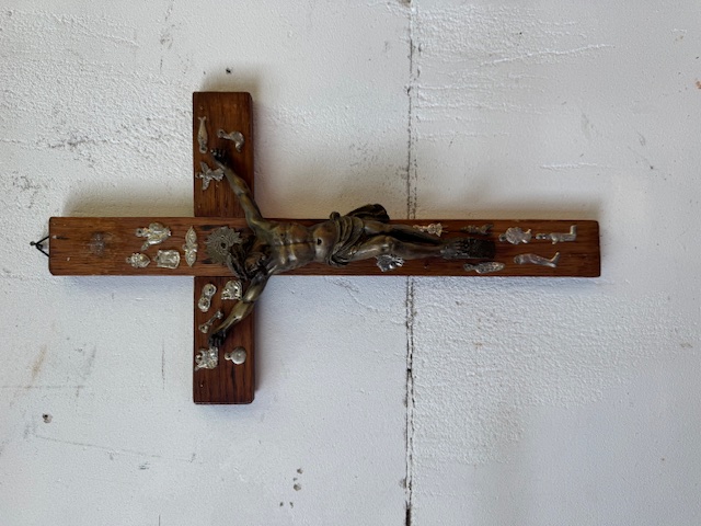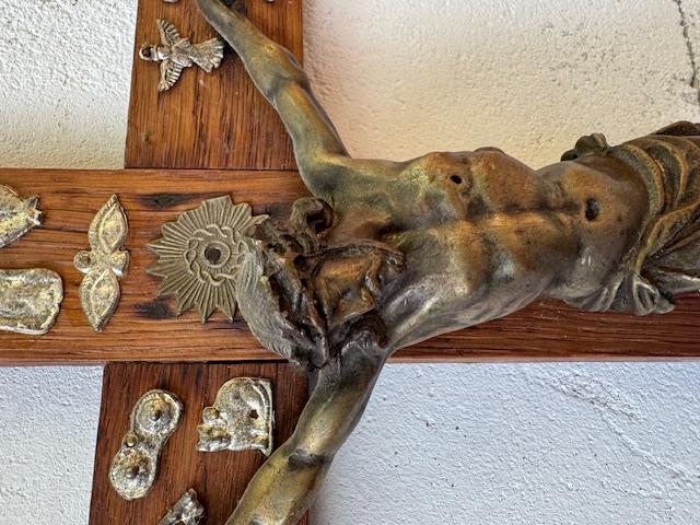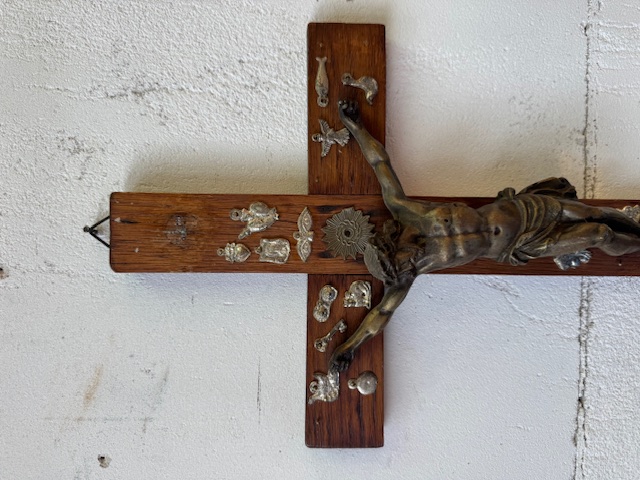 Bijzonder kruisbeeld (niet eerder gezien) met allerlei ex voto plaatjes.