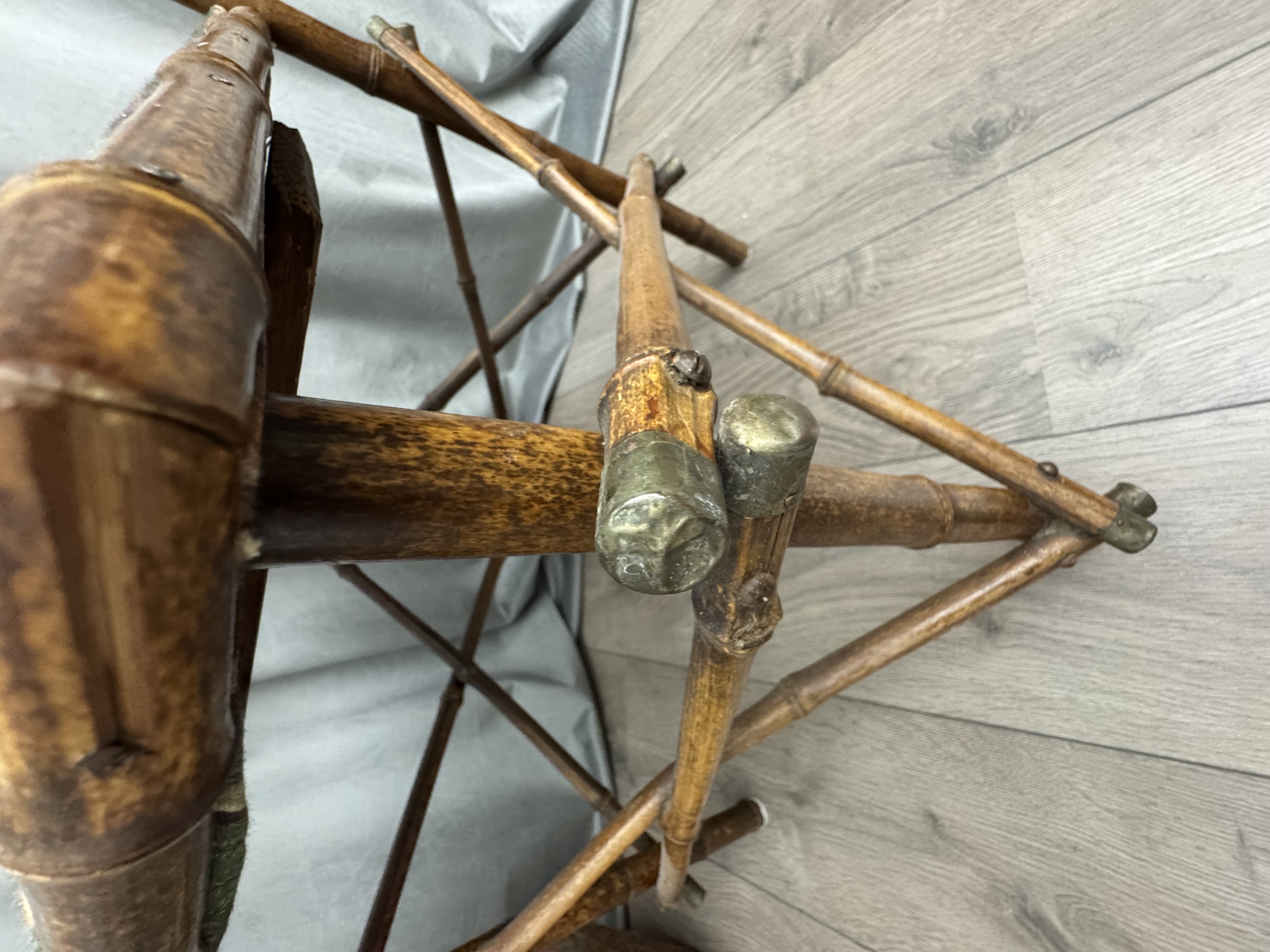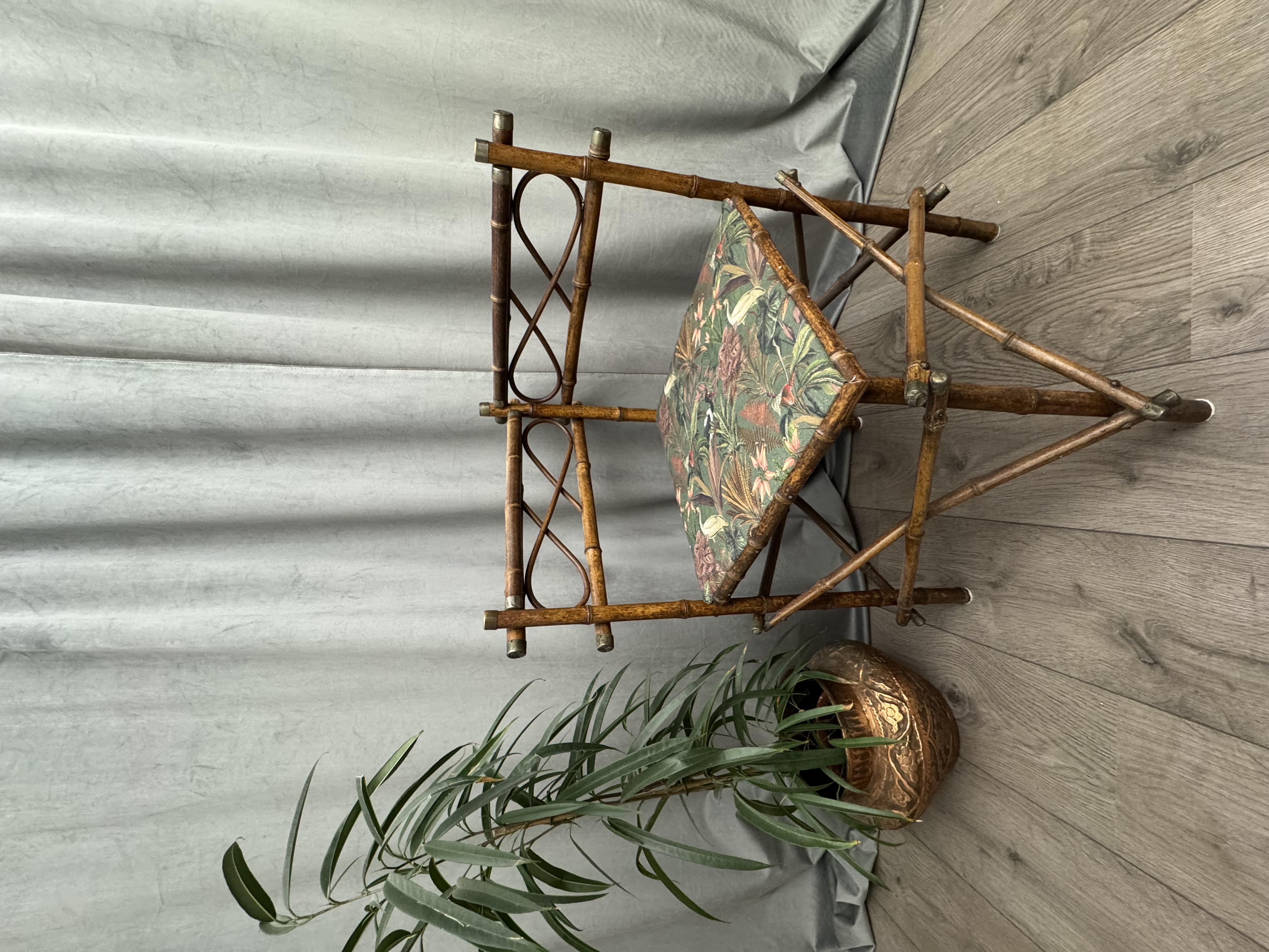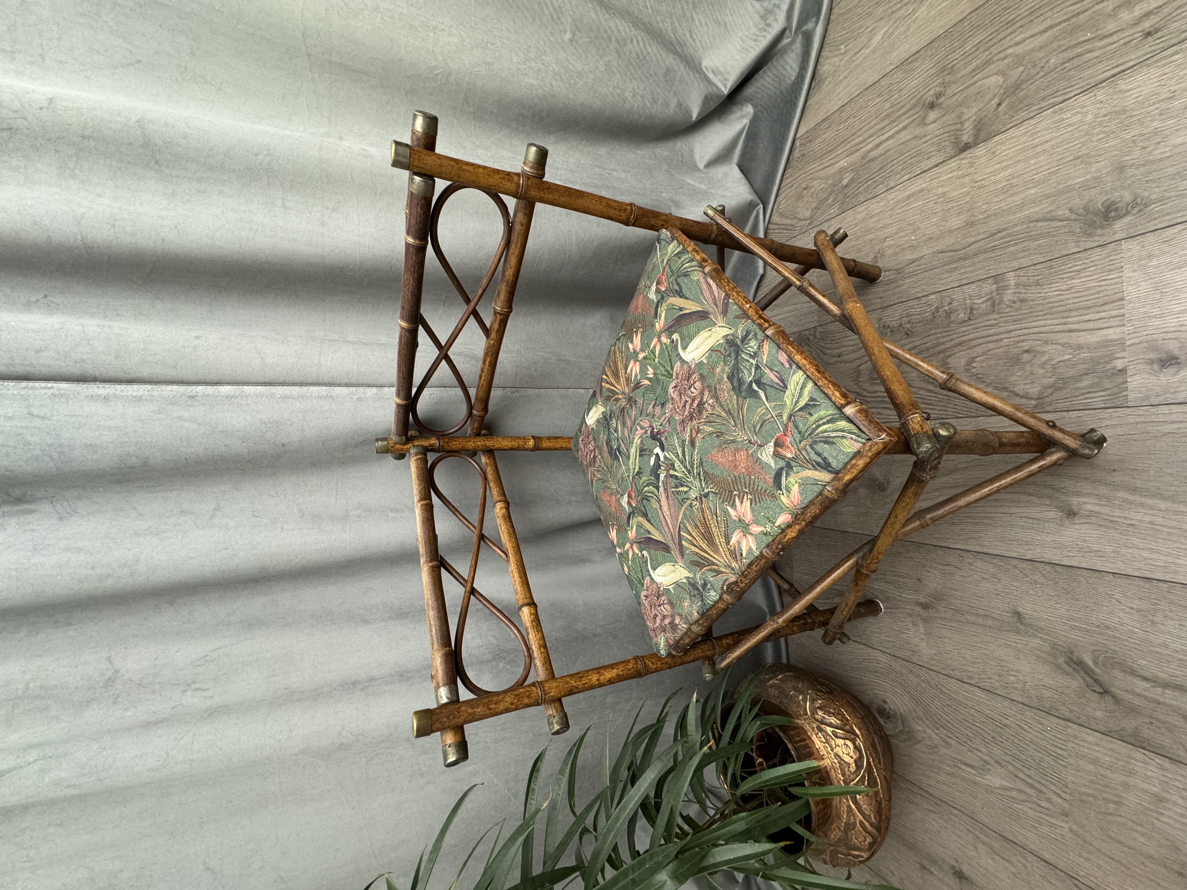 Prachtig antiek hoekstoeltje gemaakt van bamboe met messing accenten.