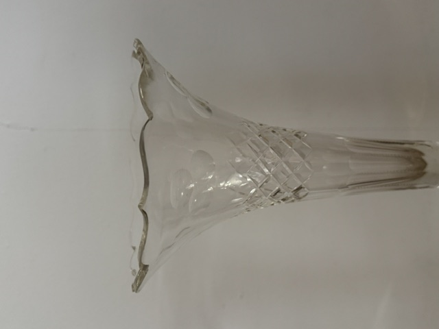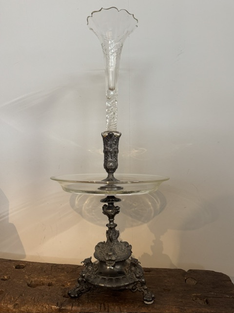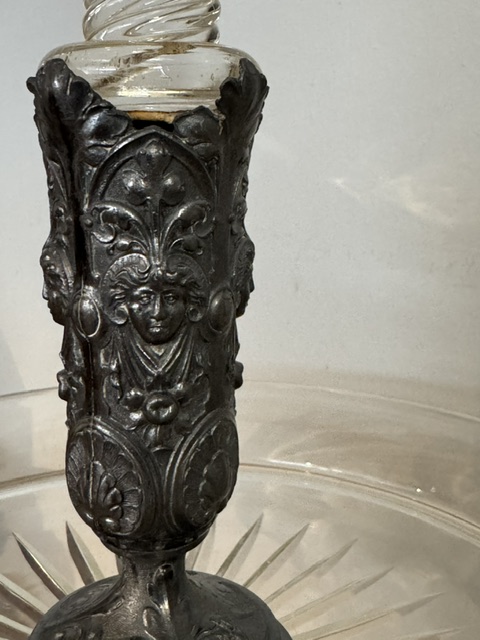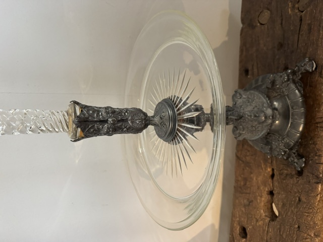 Uitgevoerd in tin en glas / kristal.