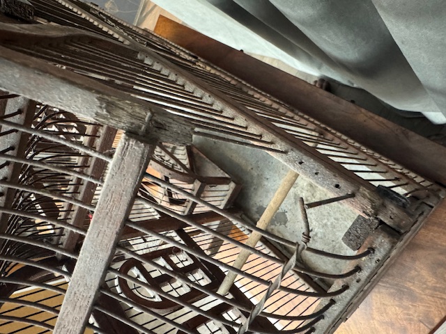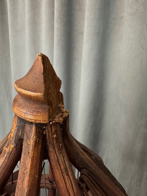 Op de laatste 2 foto's ziet u 2 mankementen. Er misssen een paar spijltjes en de sierknop bovenaan mist een stukje (zie je niks van als je het omdraait).