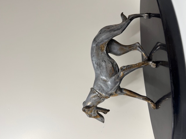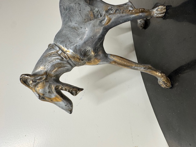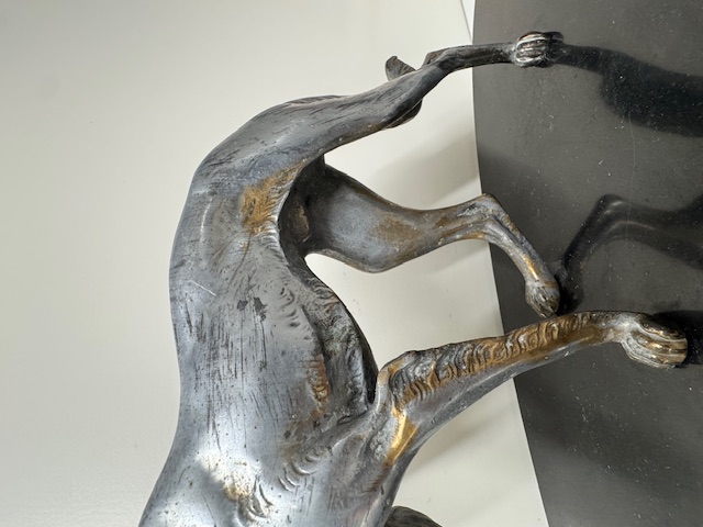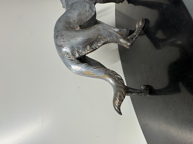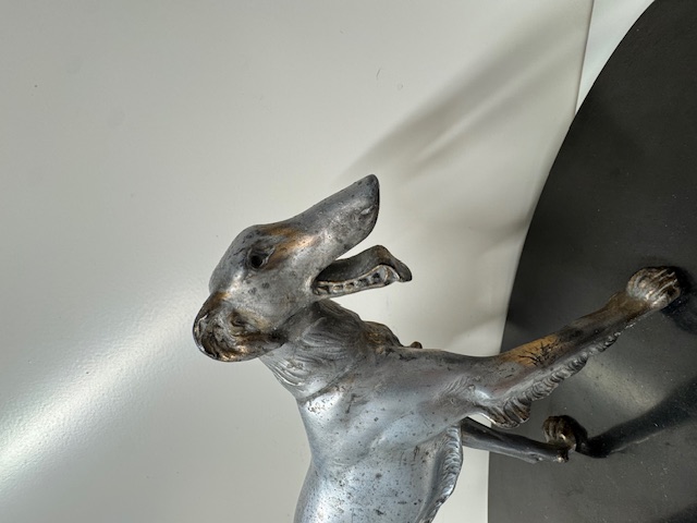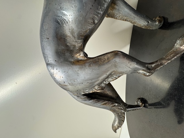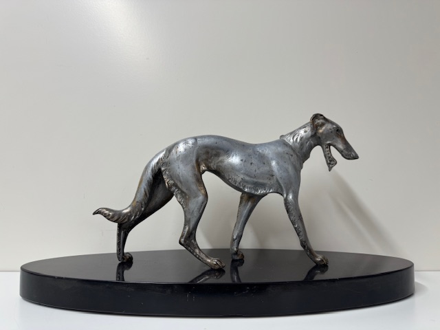 Fors en zwaar beeld van een hond op natuurstenen sokkel.