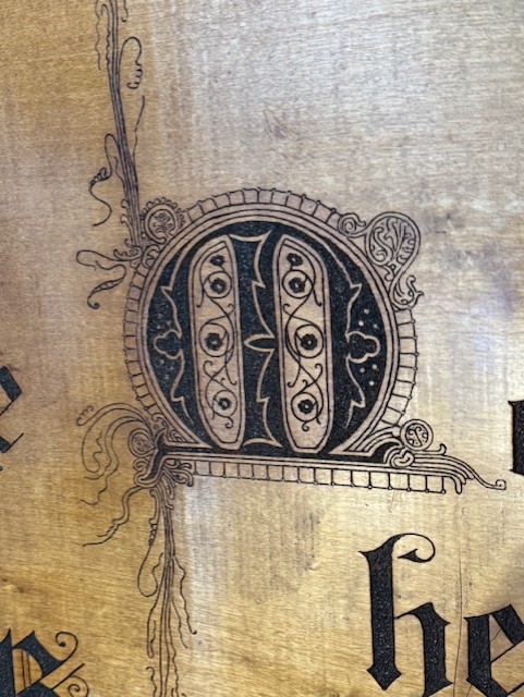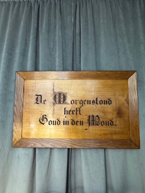 Groot art deco houtnijverheid spreukenbord: "De morgenstond heeft goud in den mond".