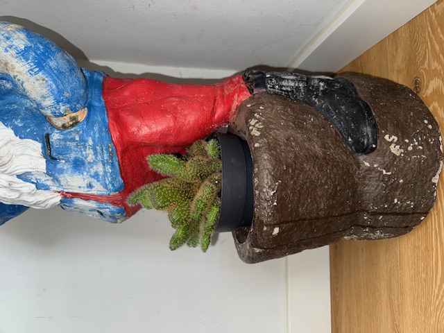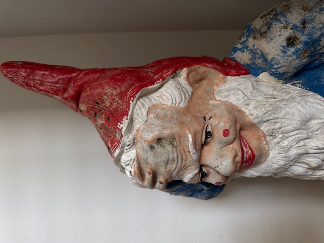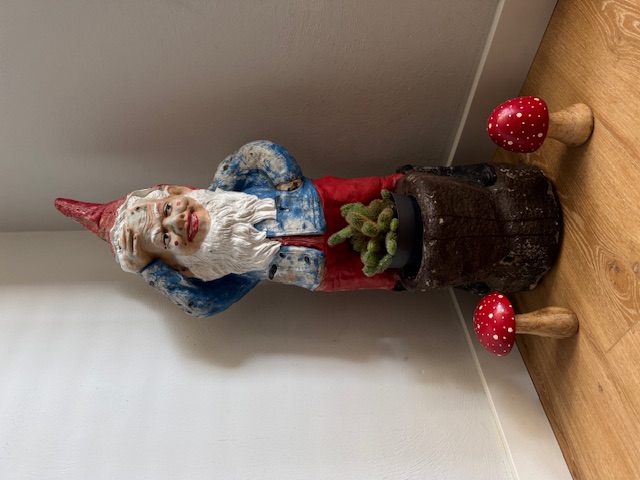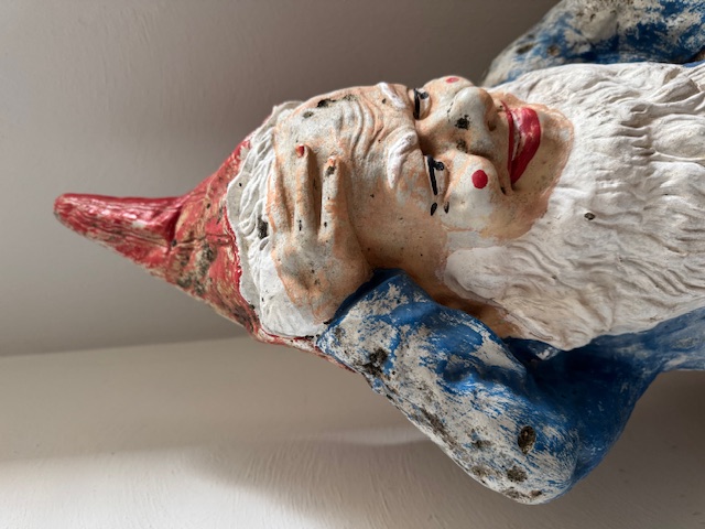 Betreft een originele oude tuinkabouter welke natuurlijk binnen ook niet zou mistaan.