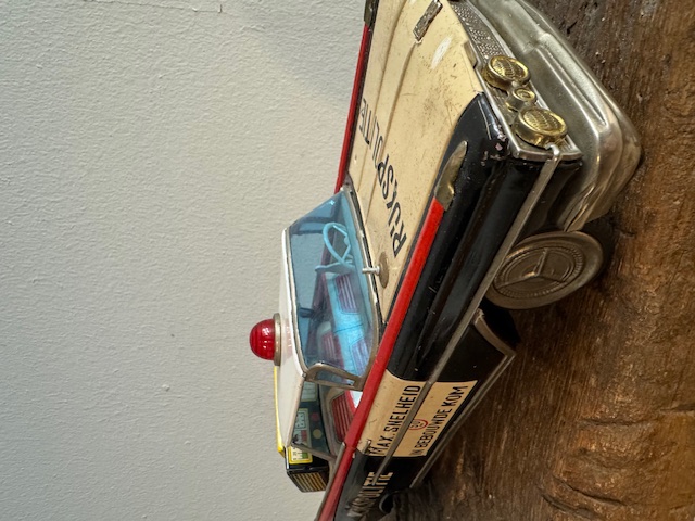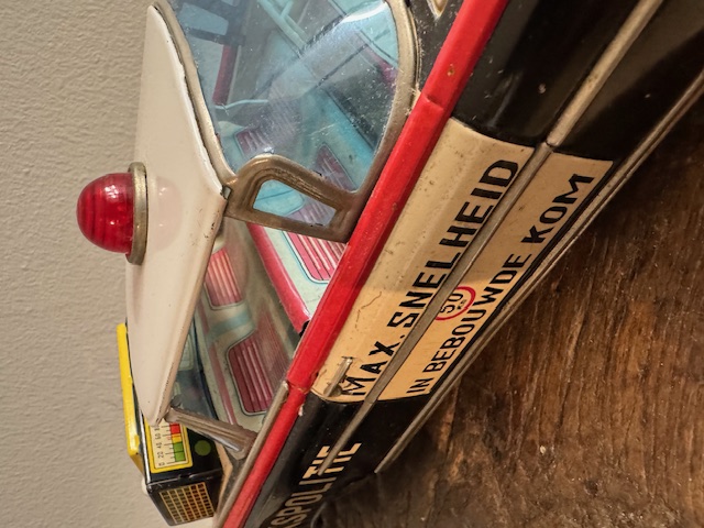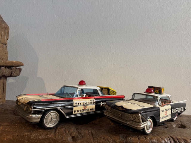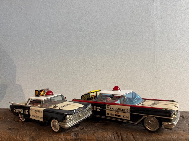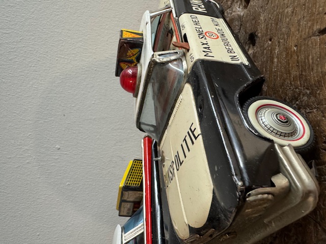 Leuke grote vintage blikken politie auto's met Nederlandes tekst.